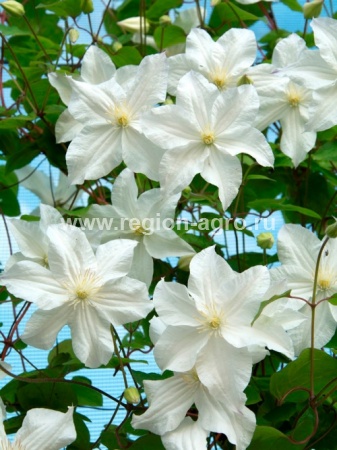 Обильноцветущий сильнорослый сорт с цветками средней величины, жемчужно-белыми, с жёлтыми тычинками, посаженными на белые прутики. Цветёт на побегах текущего года с июня по сентябрь. Лучше растёт на солнечных местах. Для использования у садовых опор и ограждений, беседок. Обрезка III (сильная)