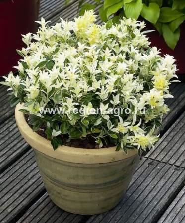 Медленно растущий густой компактный кустарник 1-1.5 м высотой. Листья зелёные с кремово-белой каймой. Цветы бело-розовые, колокольчатые. Местоположение: солнце, полутень