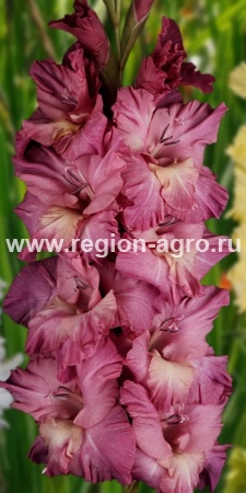 Высота 160см. Соцветие 75 см, 22 бутонов (8-9 одновременно открыты) Бутон 14 см. Насыщенно сиреневый с салатным пятном в горле на нижних лепестках. Сильно гофрирован складками-защипами на 2/3 глубины лепестков. Ткани плотные, прочные, устойчивы к солнцу и дождю, чуть искрятся. Пышный, плотный, идеально уложенный колос. Сорт ”мать-героиня” – из крупной луковицы до 7 стрелок. 477,р,Дыбов