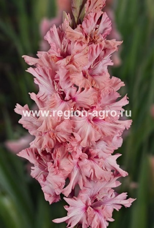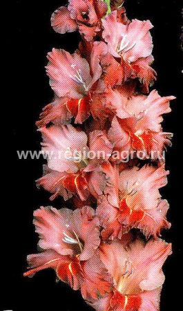 Крупный,сильный сорт с яркими гофрированными цветами.Идеальный двурядный колос. Благородного палево-розового цвета, розовые яцычки в середине цветка.