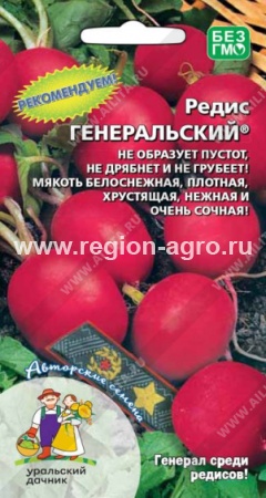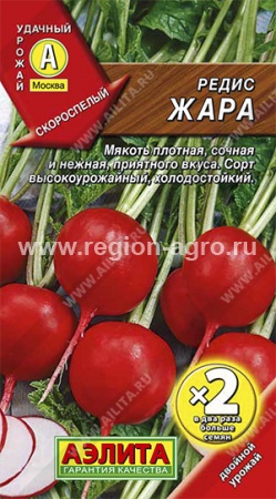 Один из лучших сортов для всесезонного выращивания в закрытом и открытом грунте. Среднеспелый (25-30 дней от всходов до сбора урожая), устойчивый к высоким летним температурам и преждевременному стрелкованию. Дружно формирует высокий урожай – 1,5-2,5 кг/м2. Корнеплоды крупные (15-25 г), округлые, ярко-красного цвета. Мякоть белая, вкус приятный, слабоострый. Длительное время сохраняет товарные качества, корнеплоды не растрескиваются, не дряблеют.