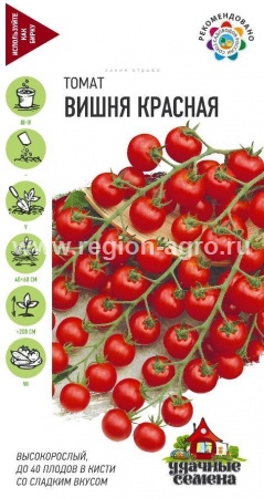 Томат черри ВИШНЯ КРАСНАЯ- Скороспелый (95-100 дней) высокорослый (более 200 см) сорт для теплиц и открытого грунта (южные регионы, с подвязкой к кольям). Плоды-черри округлой формы, собраны в длинную кисть по 20-40 шт., массой 15-20 г, сочные, с медовой мякотью. Плоды созревают в кисти одновременно, придавая растению необыкновенную декоративность. Томат черри ВИШНЯ ЖЕЛТАЯ- Раннеспелый (92-96 дней) высокорослый (более 200 см) сорт для теплиц и открытого грунта с длительным плодоношением. Черри округлой формы, желтого цвета, массой 15-20 г, очень сладкие, собраны в эффектную кисть по 20-40 плодов. Рекомендуются для фуршетных закусок, салатов, консервирования, приготовления ярких ассорти. Выращивают рассадным способом. После высадки растение формируют в один стебель, удаляя все «пасынки».